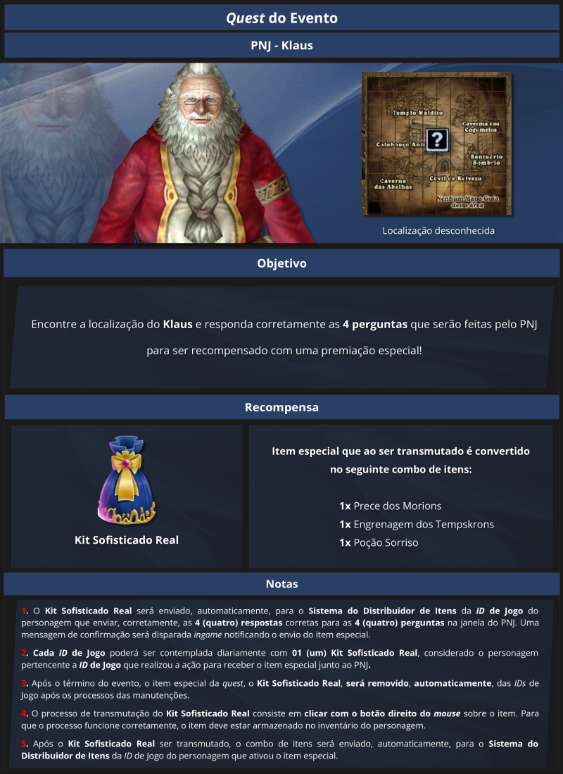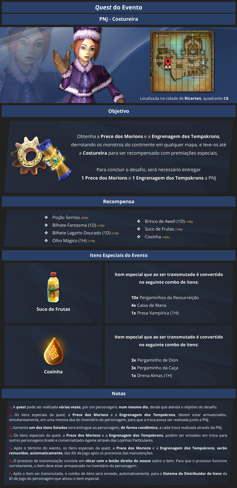 Converse com o Klaus todos os dias e receba presentes diários. Auxilie a Costureira trocando Engrenagens dos Tempskrons e Preces dos Morions por recompensas incríveis.