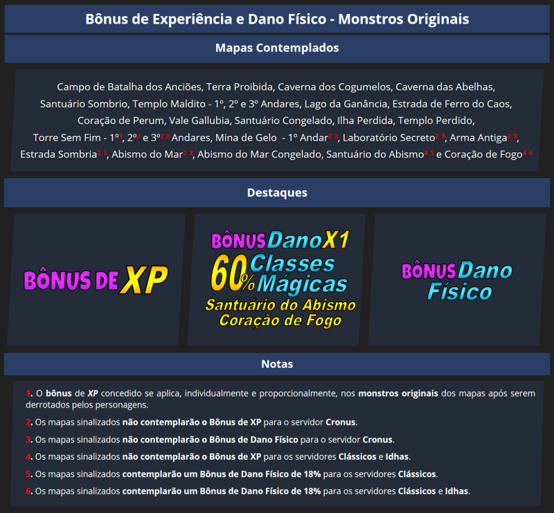 Os monstros nativos do jogo também aderiram aos eventos e concedem Bônus de Experiência e Bônus de Dano Físico, em todos os subservidores de cada servidor.