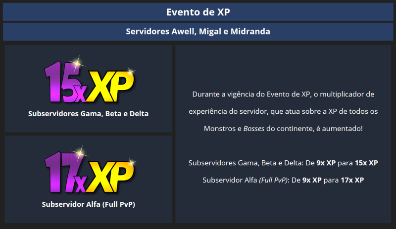 3x XP Base em todos os subservidores, em respeito às características de