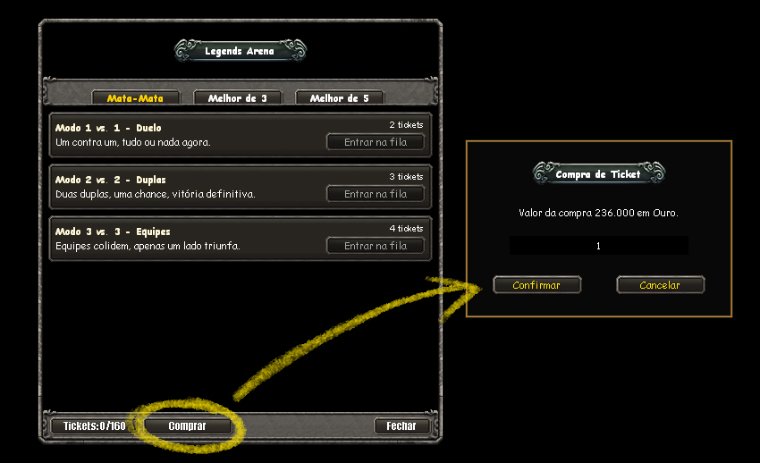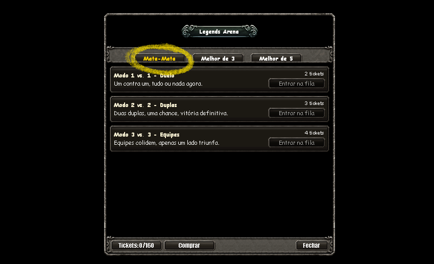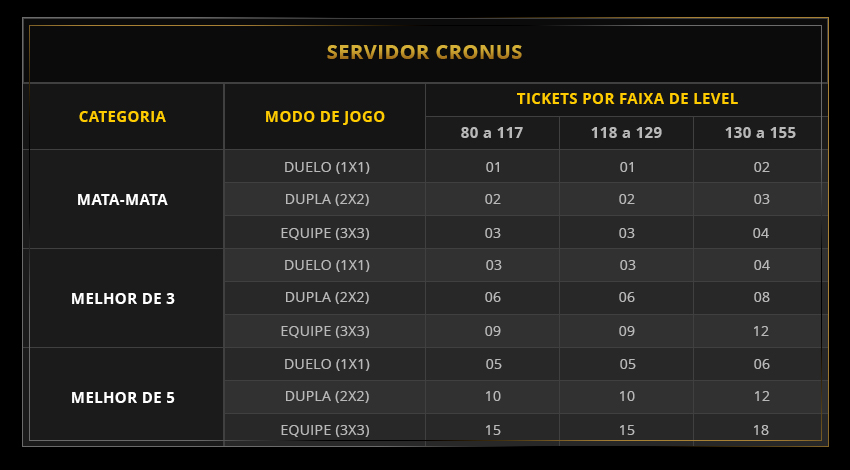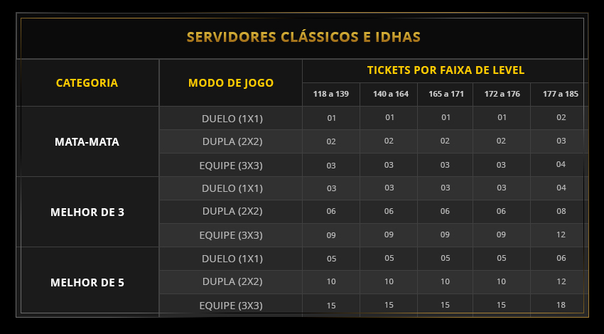 Cada modalidade exige um número específico de Tickets, que varia conforme a categoria desejada e a faixa de nível do seu personagem.