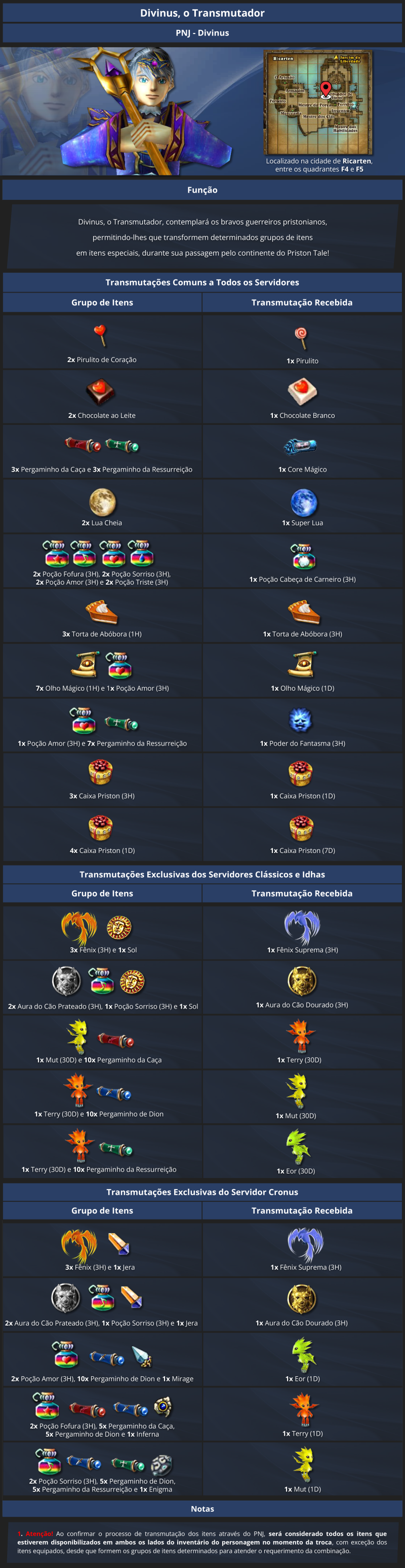 Canalizando toda a sua energia, o Mestre Transmutador evoca novas combinações para trocar itens pouco usados por outros mais úteis nas aventuras cotidianas dos guerreiros pristonianos.
